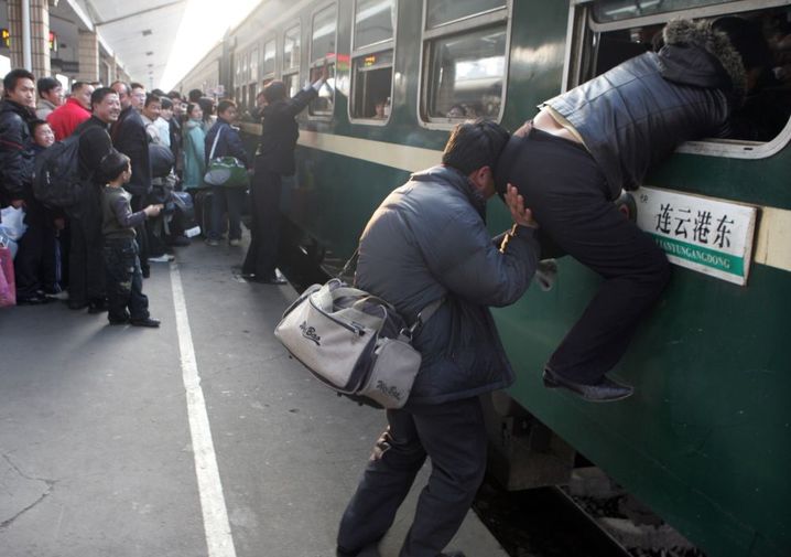 2007年2月26日,在湖北省武汉市汉口火车站,一名乘客试图从车窗上车。新华社发