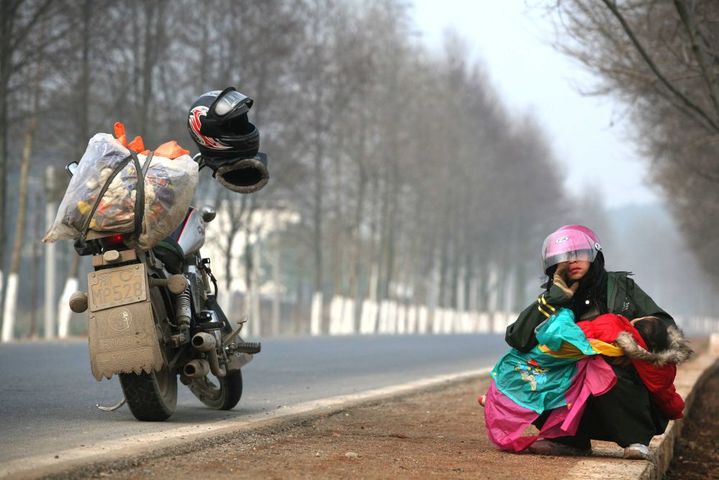 2010年1月30日,摩托车返乡队伍在路上小憩,小女孩在妈妈的怀里睡着了。新华社发(梁振堂 摄)