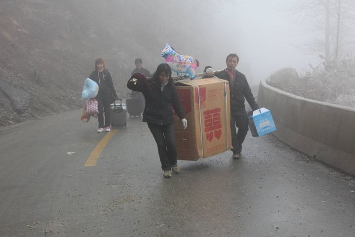 2011年1月30日,贵州黔西南望谟县209省道因结冰导致春运返乡车辆无法通行,一些归心似箭的旅客,抬着物品步行回家。新华社发(吴绍衡 摄)