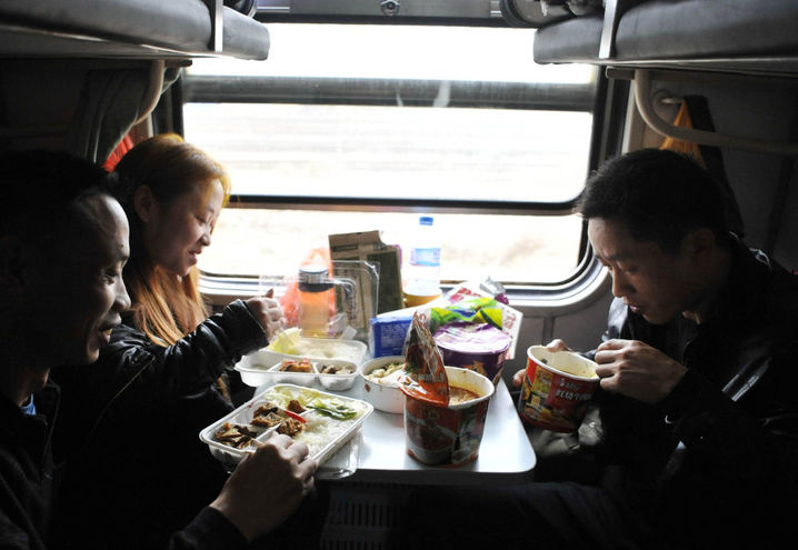 2013年2月2日,在广州至成都的L570次列车上,几名旅客在吃午饭。新华社记者陈晔华摄