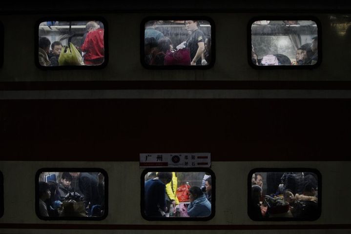 2014年1月16日,旅客在广州火车站的列车上等候启程。新华社记者 邢广利 摄