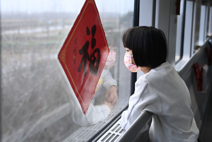2023年1月18日,准备跟妈妈、弟弟一起回重庆外婆家过年的贝贝在从杭州东站发往重庆北站的列车窗边观看沿途的风景。新华社记者黄宗治摄