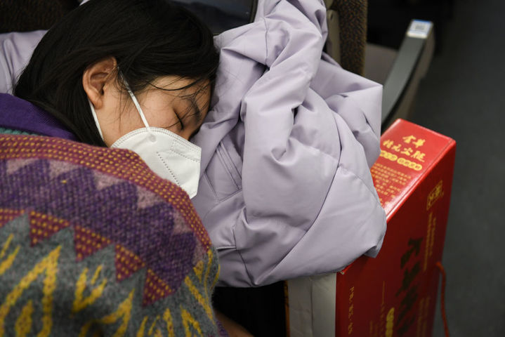 2023年1月14日凌晨,在上海虹桥开往亳州南的G9480次高铁列车上,一名旅客进入梦乡,身旁摆放着她要带回老家的年货。新华社记者张端摄