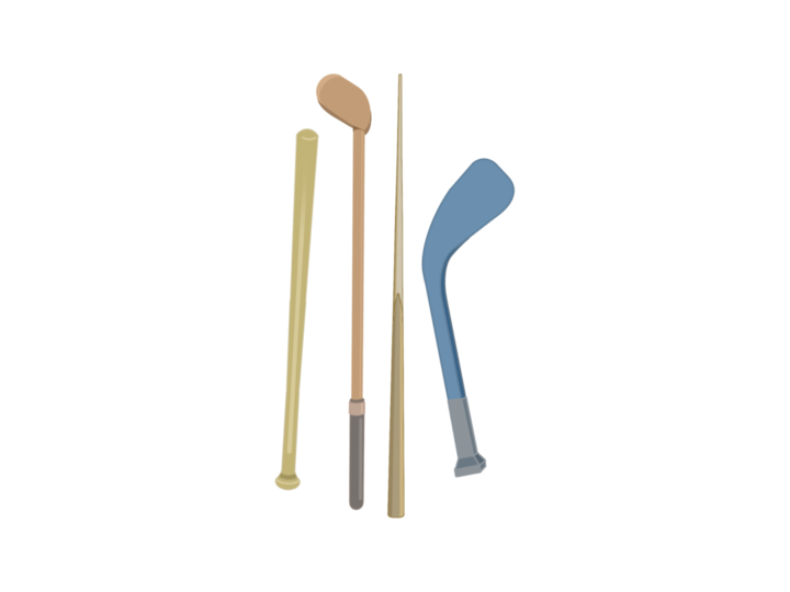 球棒、棍棒、桌球杆、曲棍球等钝器。