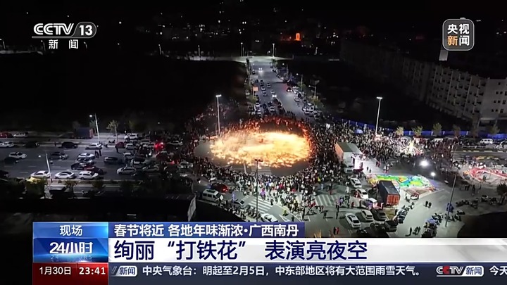 在广西河池南丹县,一场绚烂的“打铁花”非遗表演点亮夜空。一勺勺滚烫的铁水在匠人的击打下,化作一朵朵铁花璀璨绽放。市民纷纷拿出手机拍照打卡,记录这美丽的瞬间。
