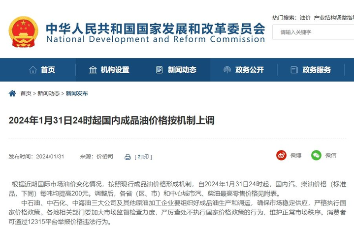 根据近期国际市场油价变化情况,按照现行成品油价格形成机制,自2024年1月31日24时起,国内汽、柴油价格(标准品,下同)每吨均提高200元。调整后,各省(区、市)和中心城市汽、柴油最高零售价格见附表。
