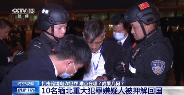 总台央视记者 陈昱:1月30日,缅甸警方依法向我国公安机关移交10名重大犯罪嫌疑人,其中包括6名缅北涉我电信网络诈骗犯罪集团重要头目。由我国公安机关押解回国。