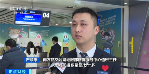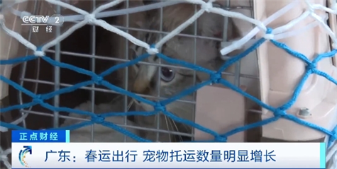 南方航空公司地服部旅客服务中心值班主任 严顺康:春运开始以来,进出港的宠物托运数量超过70只。从广州出发,宠物托运数量超过60%,较平时有40%~50%的数量增长。