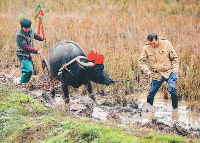 日前,四川省华蓥市阳和镇蔡家湾村的农民在田间“犁春牛”,迎接即将来临的立春。邱海鹰摄(人民视觉)