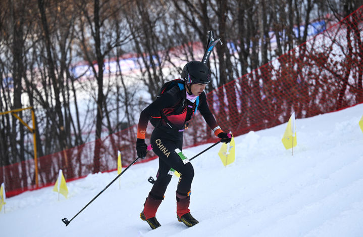 1月30日,西藏选手玉珍拉姆在比赛中。当日,在内蒙古呼伦贝尔扎兰屯市金龙山滑雪场举行的第十四届全国冬季运动会滑雪登山公开组女子短距离比赛中,西藏选手玉珍拉姆获得冠军,这也是全冬会历史上首枚滑雪登山项目金牌。新华社记者 贝赫 摄