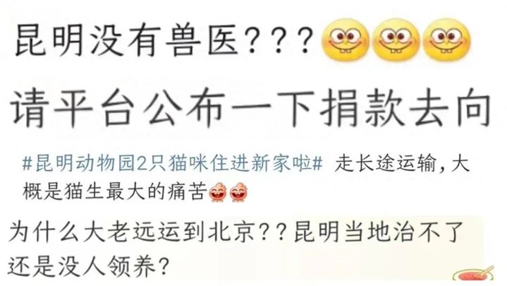 “为何要把两只猫从云南运到北京?”“昆明当地治不了还是没人领养?”“对于这两只长期遭受欺负的猫来说,长途飞行是否有应激风险?”一位爱猫人士表示,长途运输对猫来说很痛苦。在直播间和短视频平台,不少网友对中国小动物保护协会的做法提出疑问。