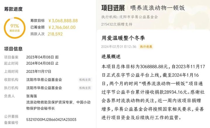 截至2月2日,由中国小动物保护协会秘书长张海强为责任人的“喂养流浪动物一顿饭”项目共吸引20余万人捐款,获得筹款金额276万余元。从1月16日至2月2日,该项目共筹集273万余元。