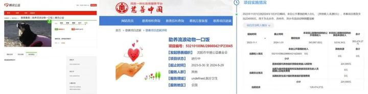 这位华易基金会工作人员还向记者介绍,2023年5月,华易基金会和中国小动物保护协会首次合作,筹款项目“助养流浪动物一口饭”在腾讯公益上线,目前已经结束。所筹款项、招标信息、采购支出、支出明细等均在筹款平台和慈善中国平台进行公示。然而,记者在查阅相关网站后发现,在筹款平台,“助养流浪动物一口饭”项目显示“募款结束,请查看结项报告!”而“结项报告”一栏则显示“项目报告等待中!”,在“项目进展”一栏并未出现工作人员提到的“招标信息”“采购支出”“支出明细”等信息,仅有“捐赠物资接收证明”;而在慈善中国平台,“助养流浪动物一口饭”项目则显示“进行中”,公示内容仅有“当前结余”“当期收入”“当期支出”等信息。