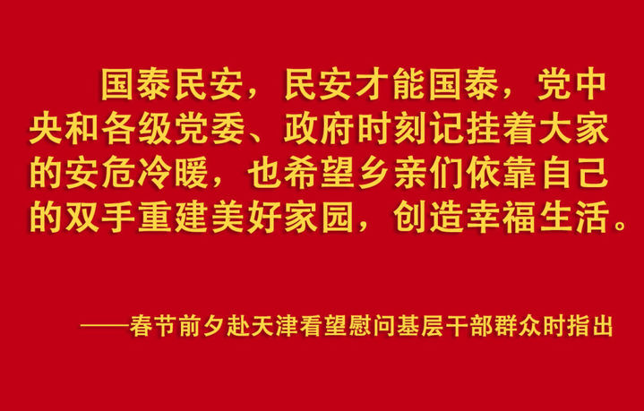 春节前夕,习近平总书记在天津考察调研,看望慰问基层干部群众。2月1日上午,他首先来到西青区辛口镇第六埠村,实地了解去年洪涝灾害后当地农业生产恢复等情况,看望受灾群众。