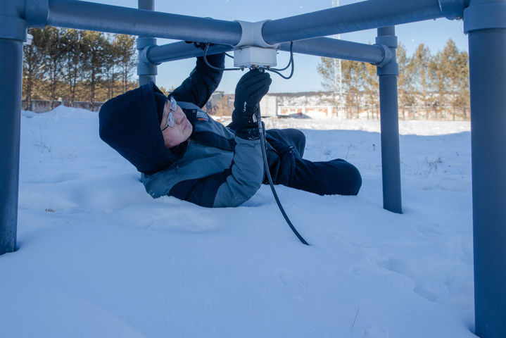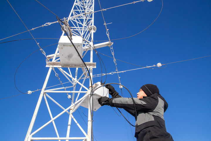 2月2日,中国科学院地质与地球物理研究所黑龙江漠河地球物理国家野外科学观测研究站科研人员刘纪康在检查测高仪接收天线阵。
