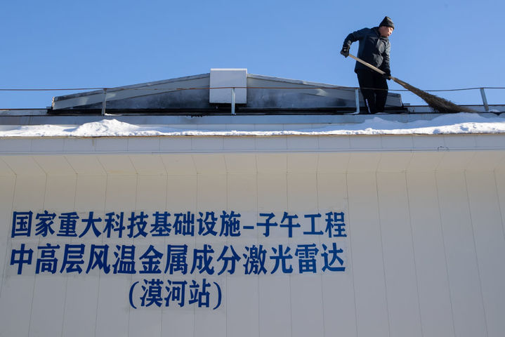 2月2日,在中国科学院地质与地球物理研究所黑龙江漠河地球物理国家野外科学观测研究站,科研人员高凤信在清理观测室的积雪保证设备安全。