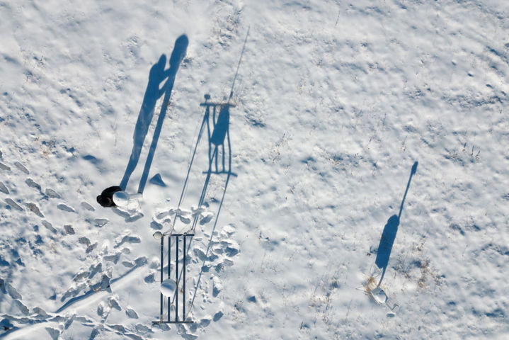 2月2日,在中国科学院地质与地球物理研究所黑龙江漠河地球物理国家野外科学观测研究站,刘纪康在流星雷达发射天线旁巡检(无人机照片)。