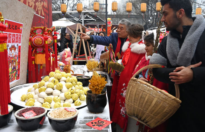 2月2日,在西安永兴坊举行的小年活动上,来自西安各大学的留学生在民俗专家的讲解下了解小年祭灶所用的物品。 新华社记者 刘潇 摄