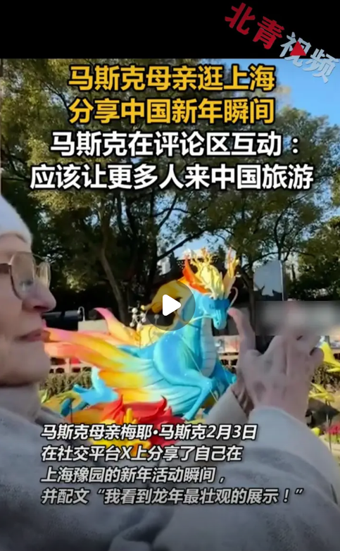 马斯克母亲逛上海分享中国新年瞬间,马斯克:应该让更多人来中国玩