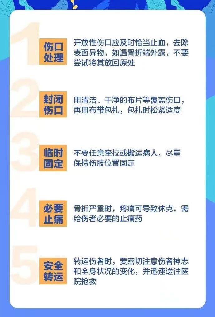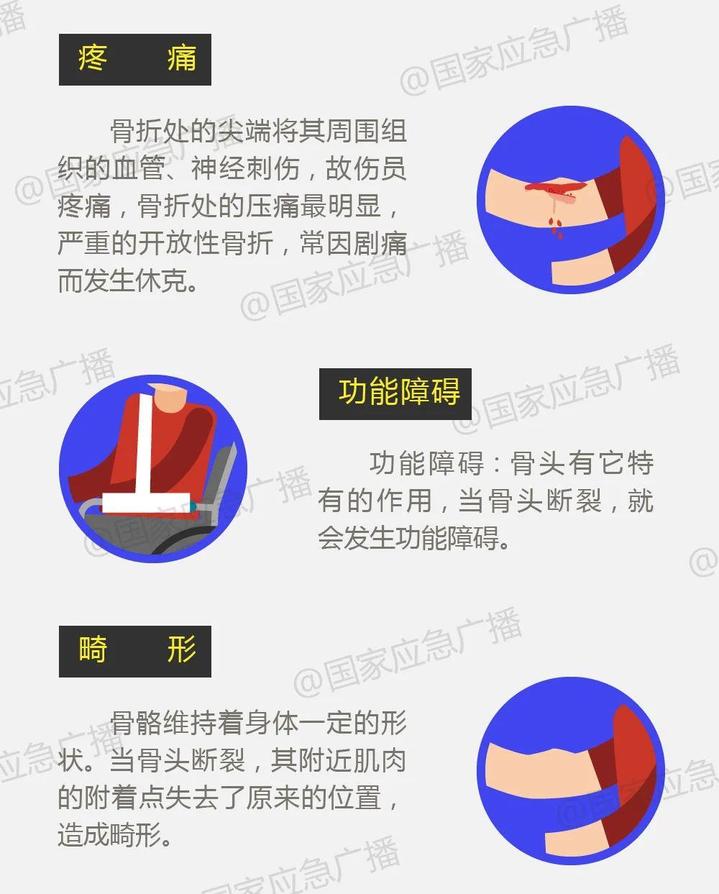 手臂骨折:可以使用报纸、杂志、雨伞等随身物品作为支撑物,用毛巾或衣服袖子等将手臂与支撑物绑定在一起,最后将手臂固定在脖子上。