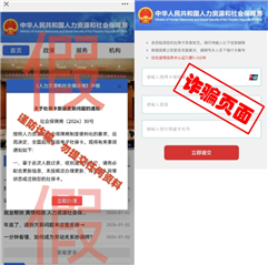 或者假冒人社部门官方网站,在仿冒网站上设置弹窗或链接,诱骗群众在页面上填写姓名、身份证号、银行卡号等信息,利用窃取的个人信息实施诈骗。