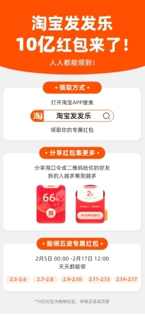 据悉,为了烘托用户春节接好运、阖家欢的氛围,“淘宝10亿红包发发乐”活动将贯穿春节全周期,分开运红包、龙年红包、拜年红包、串门红包、财神红包五波,连发13天。