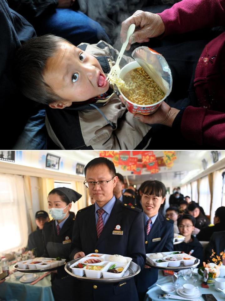拼版照片:上图为2011年1月21日,在广东首趟外来务工人员专列L160次列车上,一位乘客在喂孩子吃方便面(新华社记者郭晨摄);下图为2024年1月17日,乘务员在K212/209次列车餐车上展示盒饭套餐(新华社记者黄宗治摄)。