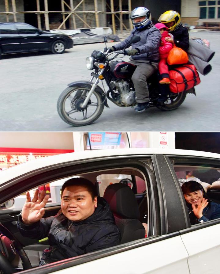 拼版照片:上图为2013年2月2日,在福建务工的董日旭带着家人骑摩托车返回江西老家过年(新华社发);下图为2020年1月15日,董日旭开着他新买的汽车,准备和家人开车返乡过年(新华社记者魏培全摄)。