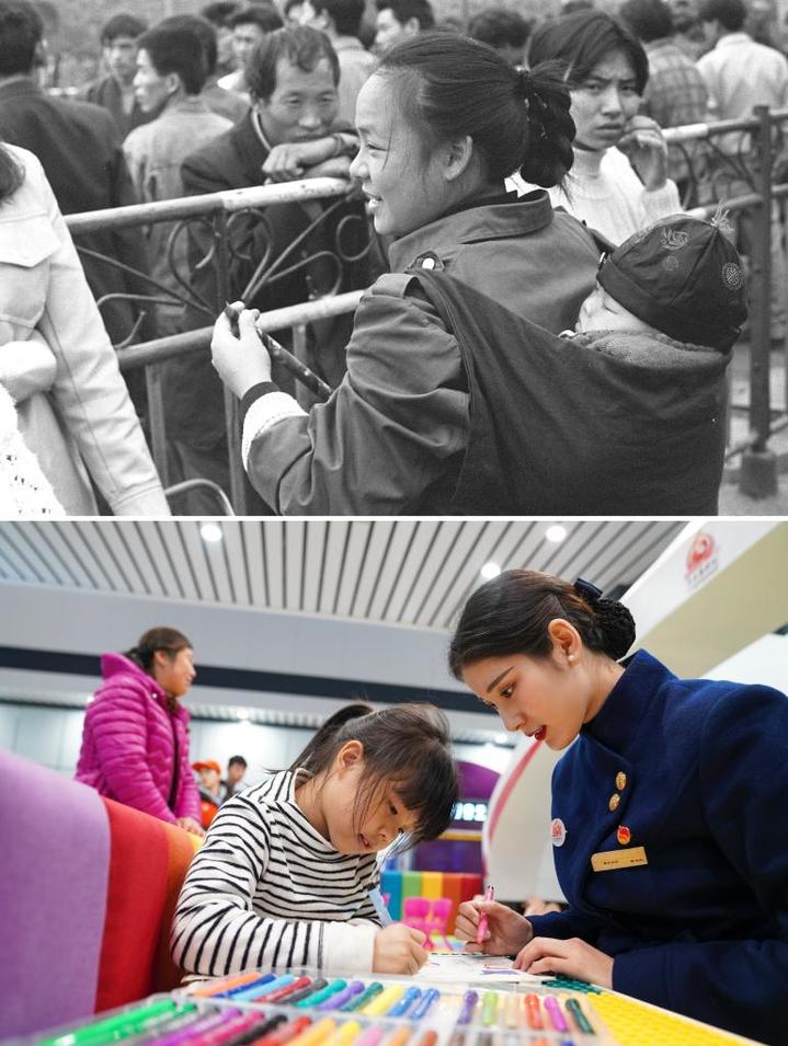拼版照片:上图为1995年春运期间,在广州火车站,来自四川的“打工妹”赶早乘火车回家过年(新华社记者陈学思摄);下图为2020年1月10日,在重庆西站红岩服务站的儿童游乐园内,志愿者曾念红(右)陪伴候车的小朋友画画(新华社记者刘潺摄)。