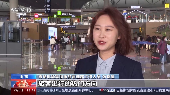 青岛机场集团服务管理部工作人员 张晓晨:春运期间,旅客出行的热门方向集中在国内东北、华南、西南等地区及日韩、东南亚等国际目的地。