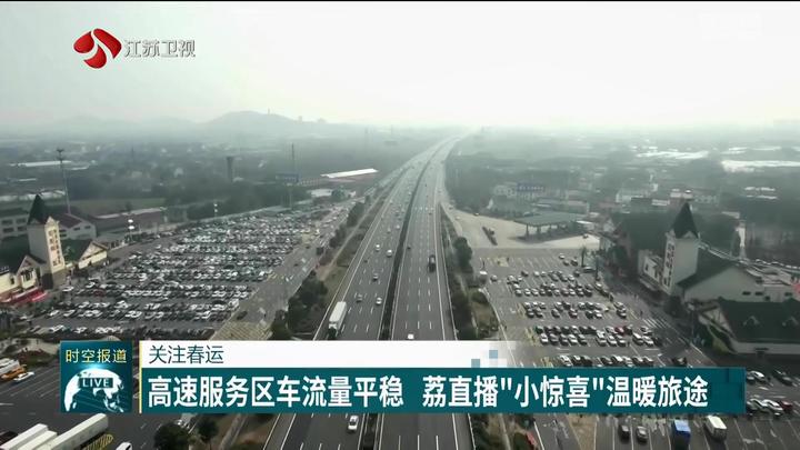 江苏台记者吴迎旋:“我现在所在的位置是往南京方向的常州芳茂山服务区。春运期间,截止到昨天,芳茂山服务区已经累计接待车流量24.7万。预计今天的车流量是2.2万左右,在平时这个数字只有1.5万。大家看我身边已经很热闹了,旅客朋友们已经排起了长队。这是因为我们江苏广电融媒体新闻中心的小伙伴们已经把新闻快闪车带到了现场。”