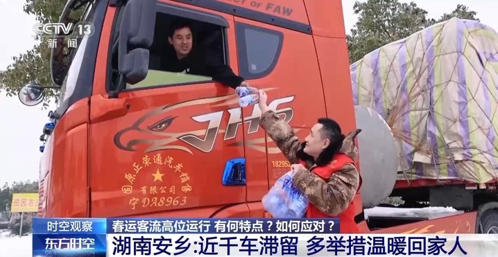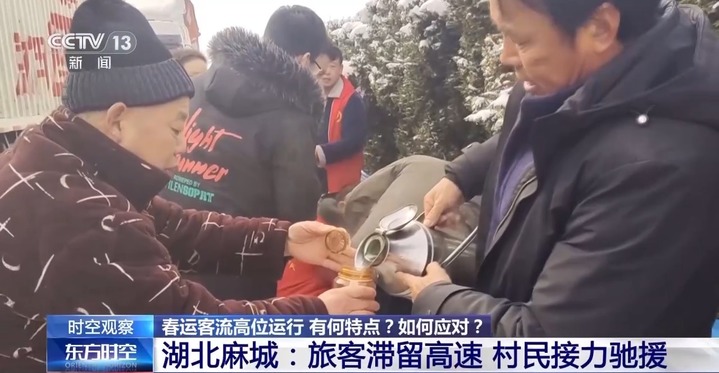 麻城市梅花山村村民 夏亚玲:我家窗户对面就是大广高速,看到高速公路上已经堵了非常多的车,我毕竟从外面回来,开车那么久,知道在外面打工不容易。所以那天我起得很早,让我爷爷在家烧开水,然后我爸我妈我孩子,发动全家,尽我们一点绵薄之力,给司机朋友们送点吃的,送点喝的。