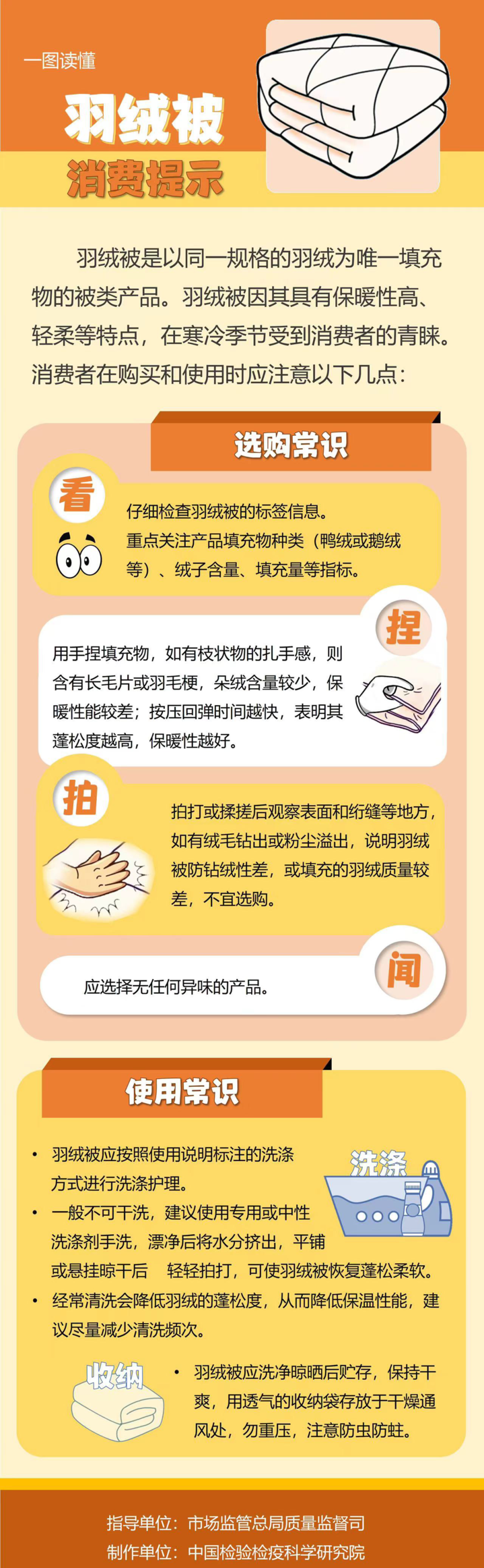 羽绒被是以同一规格的羽绒为唯一填充物的被类产品,具有保暖性高、轻柔等特点,在寒冷季节受到消费者的青睐。消费者在购买和使用时应注意以下几点:仔细检查羽绒被的标签信息;用手捏填充物,如有枝状物的扎手感,则含有长毛片或羽毛梗,朵绒含量较少,保暖性能较差;按压回弹时间越快,表明其蓬松度越高,保暖性越好。拍打或揉搓后观察表面和绗缝等地方,如有绒毛钻出或粉尘溢出,说明羽绒被防钻绒性差,或填充的羽绒质量较差,不宜选购。应选择无任何异味的产品。羽绒被一般不可干洗,建议手洗。使用专用或中性洗涤剂,漂净后将水分挤出,不建议拧干或甩干,平铺或悬挂晾干后轻轻拍打,以使羽绒被恢复蓬松柔软。建议尽量减少清洗频次。