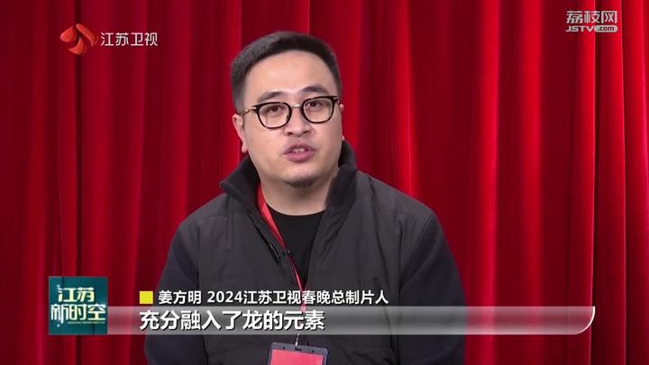 2024江苏卫视春晚总制片人姜方明介绍,从舞台上面可以看到一条龙和一只凤,“龙凤呈祥”的感觉。同时,在很多节目设计中充分融入了龙的元素,包括很多视频、很多配饰,包括很多艺人嘉宾的服饰上,都有龙的元素在。