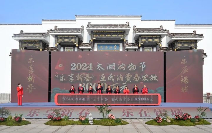活动现场,市领导与社会各界代表一同启动8000万元的2024太湖购物节“乐享新春”惠民消费券集中发放。消费券覆盖百货商超、家电家居、珠宝、汽车、餐饮、电商平台等各类消费场景,通过政银企联动,多重优惠叠加,为市民和游客提供一场红红火火、精彩纷呈的消费盛宴。