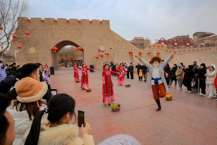 △2024年2月4日,演员在新疆喀什古城入城仪式上表演舞蹈。