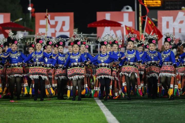 △2024年2月3日,2024年全国“村晚”示范展示活动暨贵州“村超村晚”系列活动之一的民族文化展演,在榕江县“村超”足球场举行。