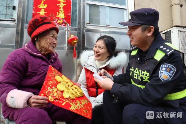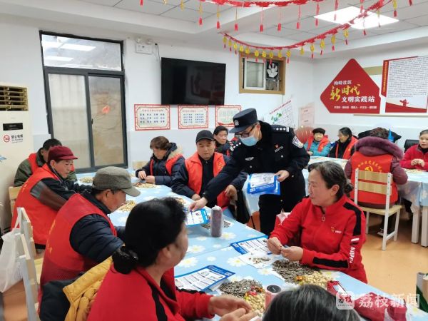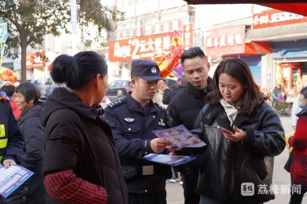 江宁分局民警向正在集市购物的市民开展反诈宣传,嘱咐大家守好钱袋子、过好幸福年