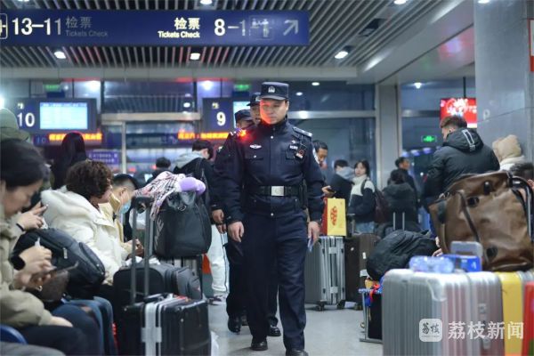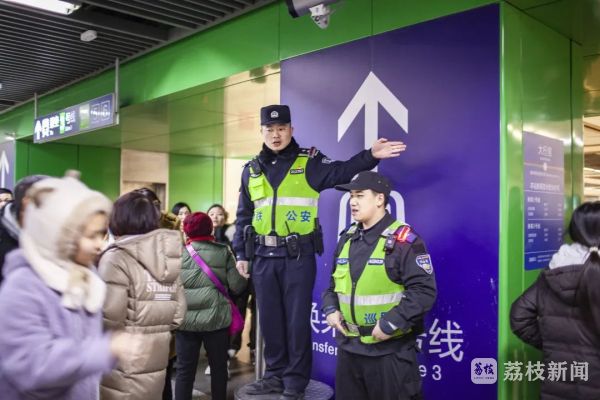 地铁分局执勤警力在地铁二号线大行宫站疏导客流、维持秩序,守护乘客平安团圆路。