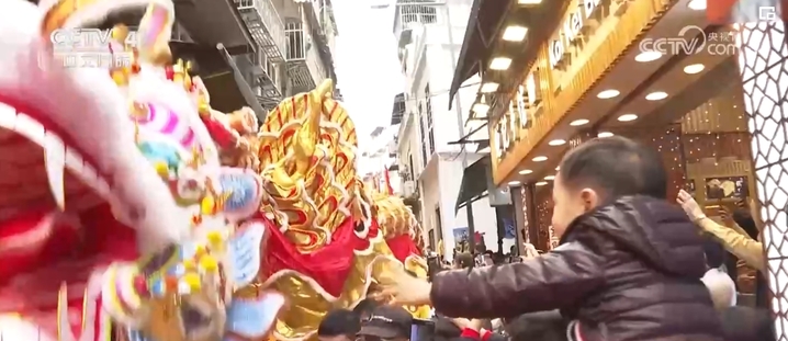 农历春节大年初一,澳门特区政府旅游局举办“欢乐春节——2024年龙腾舞跃贺新春”社区巡演活动。238米长的大金龙和18头醒狮,穿越澳门大街小巷和主要景区,市民和游客纷纷伸手触摸金龙和醒狮,迎春纳福。