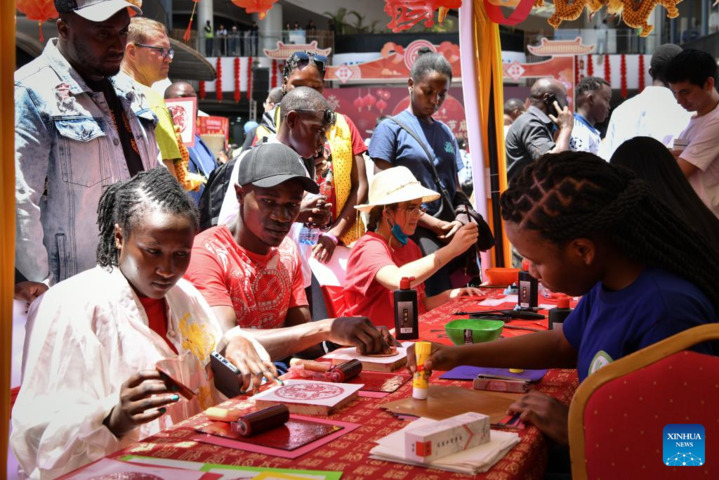 People try Chinese calligraphy and wood-block printing during the Nairobi Chinese New Year Gala in Nairobi, Kenya, on Feb. 10, 2024. (Xinhua/Han Xu)