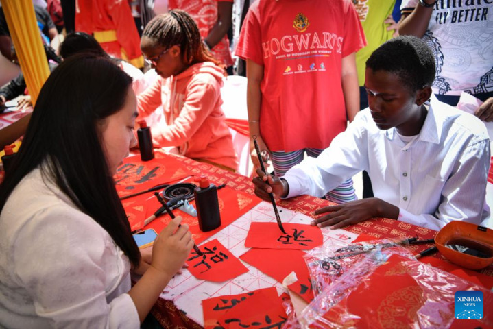 People try Chinese calligraphy during the Nairobi Chinese New Year Gala in Nairobi, Kenya, on Feb. 10, 2024. (Xinhua/Han Xu)