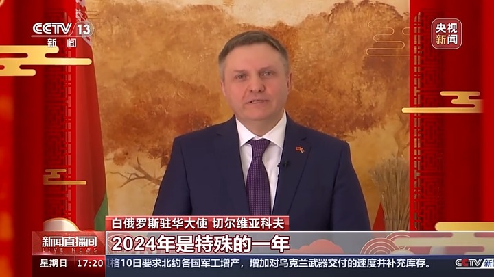 白俄罗斯驻华大使 切尔维亚科夫:2024年是特殊的一年。这一年是龙年。龙是中国的象征。2024年也是中华人民共和国成立75周年。谨此向中国朋友送上我的祝福。祝大家心想事、家庭幸福,身体健康、万事如意,礼物多多、龙年大吉。