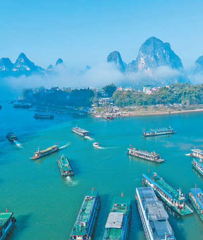 大年初二,广西桂林市阳朔县兴坪古镇,游客乘坐游船游览漓江,乐享假期。
