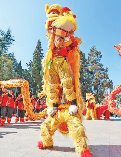 春节假期,贵州毕节市舞狮队在七星关区表演。陈 曦摄(影像中国)
