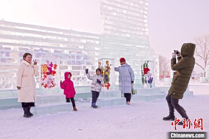 在第六师五家渠市,居民在冰雕前留影。李华北 摄