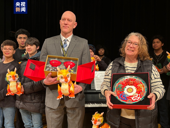 林肯中学的师生们还观看了总台制作的龙年春晚英语版。总台北美总站负责人介绍了春节和春晚的年俗文化,回答同学们的提问,并向现场的所有师生赠送龙年春晚吉祥物“龙辰辰”。校长卡尔·霍塞斯代表林肯中学接受了总台文创产品“春碗”及“五龙戏珠盘”。