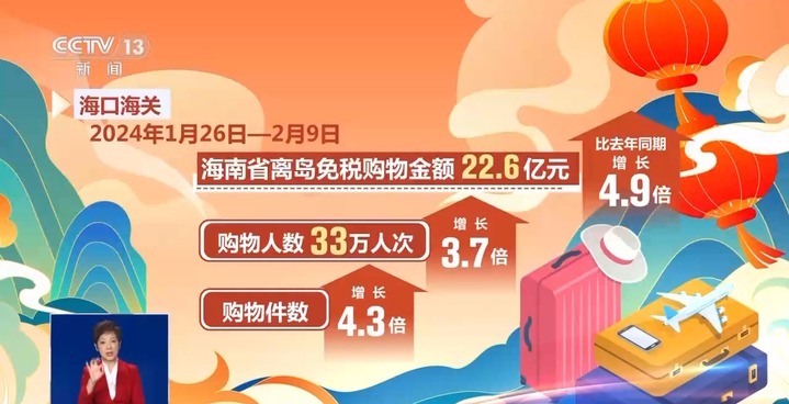 海口海关发布的一组数据显示,春运首日到年三十,也就是今年1月26日到2月9日这15天,海南离岛免税购物金额22.6亿元,比去年同期增长了4.9倍,购物人数33万人次,增长3.7倍,购物件数增长4.3倍。