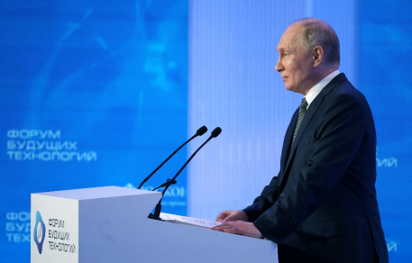 2024年2月14日,俄罗斯总统普京在莫斯科举行的未来技术论坛上发表讲话 图自俄罗斯卫星通讯社