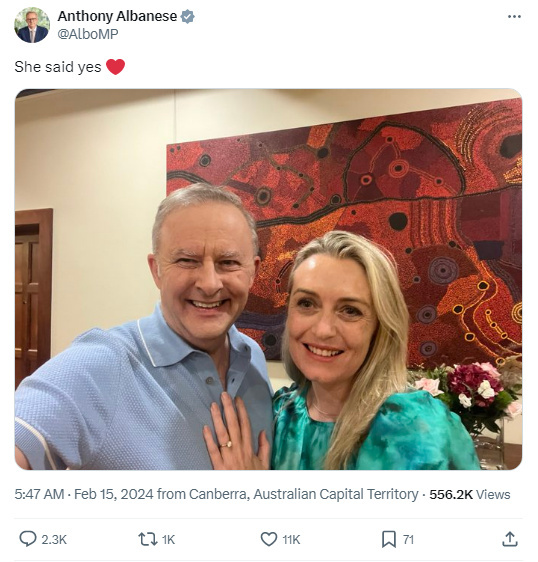 报道称,现年60岁的阿尔巴尼斯,是首位在任期内订婚的澳大利亚总理。
